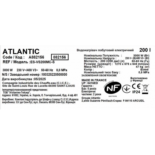 Atlantic Steatite Central Domestic Floor Standing 200 ES-VS200MC-S (3000W) — накопичувальний електричний водонагрівач, призначений для використання на об'єктах з великою потребою в гарячій воді. Цей бойлер є подальшим розвитком популярного водонагрівача Атлантик Steatite Floor Standing VSRS 200L. Нова модель отримала потужніший ТЕН і вдосконалений дизайн.