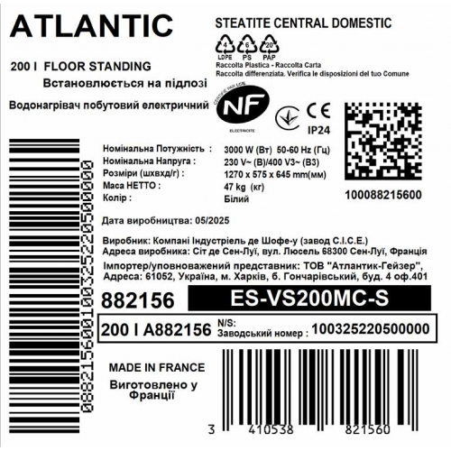 Особливості водонагрівача Atlantic Steatite Central Domestic Floor Standing 200 ES-VS200MC-S (3000W)