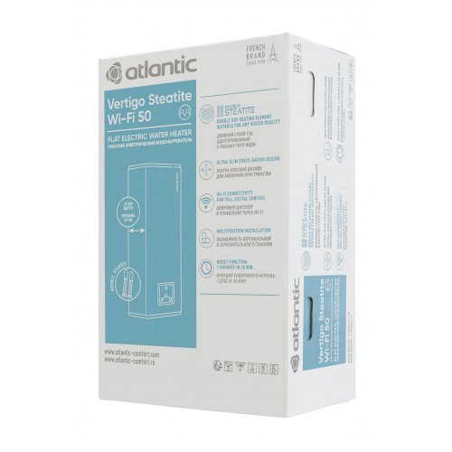 Atlantic Vertigo Steatite WI-FI 50 ES-MP0402F220-S WD (2250W) silver (старий артикул 831217) – побутовий електроводонагрівач сріблястого кольору від французького виробника Atlantic, з можливістю управління по Wi-Fi через додаток Cozytouch (завантажуйте в Google Play або App Store).