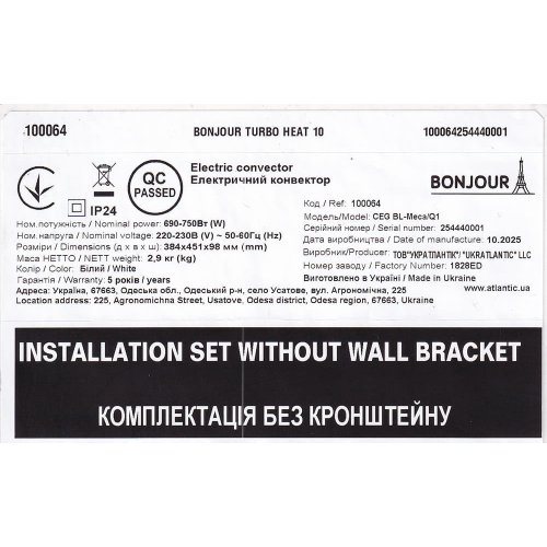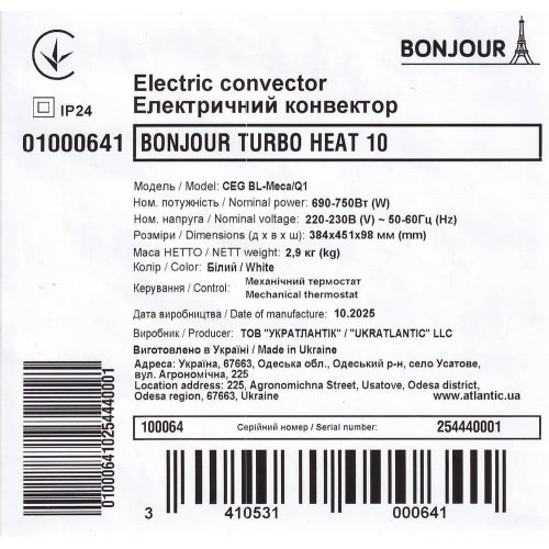 Електроконвектор Bonjour Turbo Heat 10 CEG-BL-Meca/Q1 (750W) з комплектом підставок – автономний електрообігрівач французької торгової марки Atlantic можна використовувати як в якості основного, так і додаткового джерела тепла.
