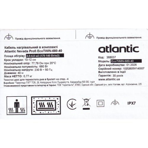 Електрична тепла підлога Atlantic Nevada Profi EcoTWIN-680-40 відноситься до IPX7 класу захисту.