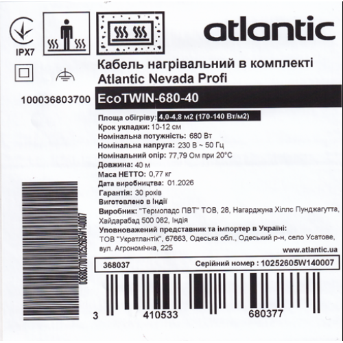 Кабель нагрівальний Atlantic Nevada Profi EcoTWIN-680-40 – двожильний електричний нагрівальний кабель від французького бренду Atlantic, виробник ТОВ «Термопадс ПВТ», Індія.
