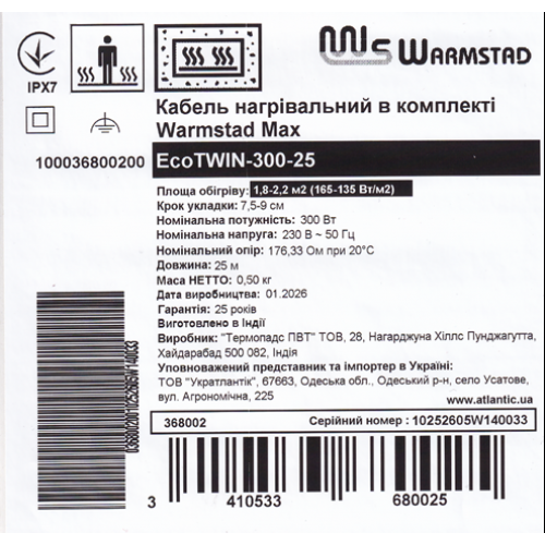Кабель нагрівальний в комплекті Warmstad Max EcoTWIN-300-25 – двожильний електричний нагрівальний кабель від французького бренду Atlantic, виробник ТОВ «Термопадс ПВТ», Індія.