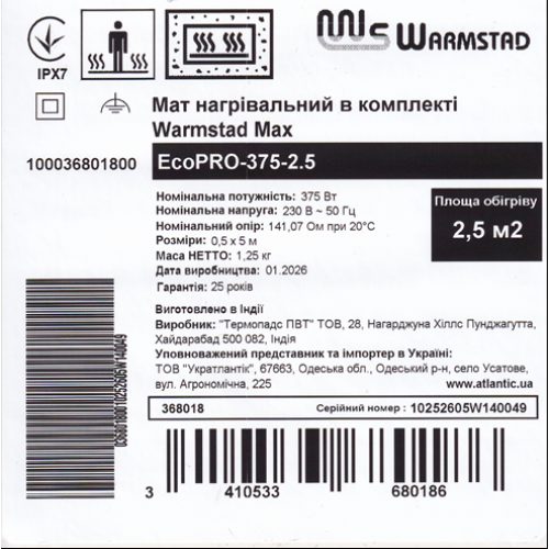 Мат нагрівальний в комплекті Warmstad Max EcoPRO-375-2.5 – двожильний електричний нагрівальний мат від французького бренду Atlantic, виробник ТОВ «Термопадс ПВТ», Індія.