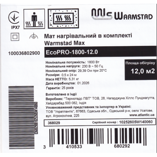 Мат нагревательный в комплекте Warmstad Max Max EcoPRO-1800-12.0 – двужильный электрический нагревательный мат от французского бренда Atlantic, производитель ООО «Термопадс ПВТ», Индия.