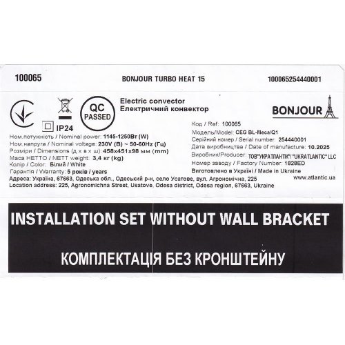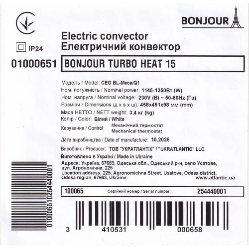 Электроконвектор Bonjour Turbo Heat 15 CEG-BL-Meca/Q1 (1250W) с комплектом подставок – автономный электрообогреватель французской торговой марки Atlantic можно использовать как в качестве основного, так и дополнительного источника тепла.