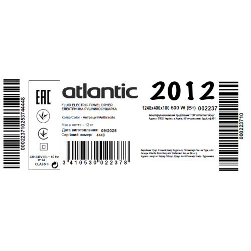 Гарантия производителя на электрический полотенцесушитель Atlantic 2012 антрацит 1248х400х100мм 500 Вт составляет 2 года.