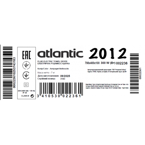 Гарантия производителя на электрический полотенцесушитель Atlantic 2012 антрацит 798х400х100мм 300 Вт составляет 2 года.