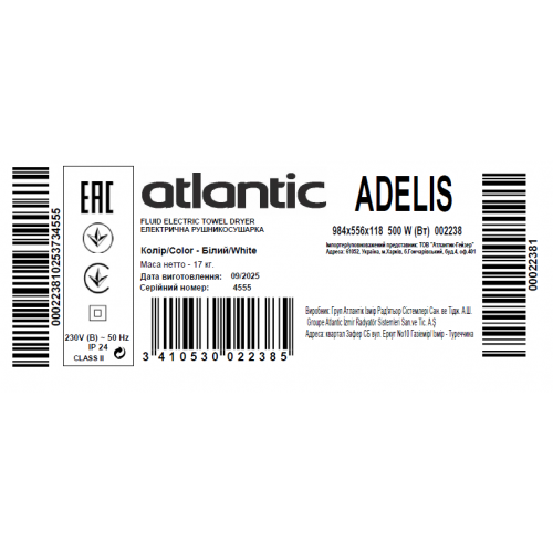 Гарантия производителя на электрический Atlantic Adelis белый 500 Вт составляет 2 года.