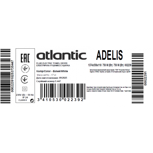 Гарантия производителя на электрический полотенцесушитель Atlantic Adelis белый 1374х556х118мм 750Вт составляет 2 года.