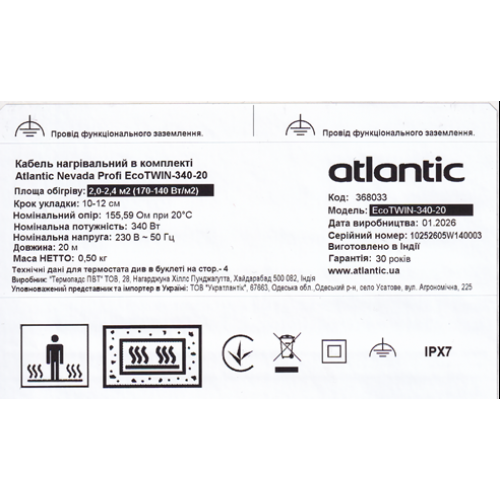 Электрический теплый пол Atlantic Nevada Profi EcoTWIN-340-20 относится к IPX7 классу защиты.
