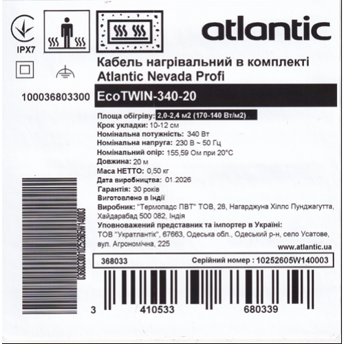 Комплект-Кабель нагревательный Atlantic Nevada Profi EcoTWIN-340-20 – двужильный электрический нагревательный кабель от французского бренда Atlantic, производитель ООО «Термопадс ПВТ», Индия.