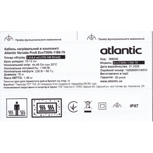 Электрический теплый пол Atlantic Nevada Profi EcoTWIN-1190-70 относится к IPX7 классу защиты.