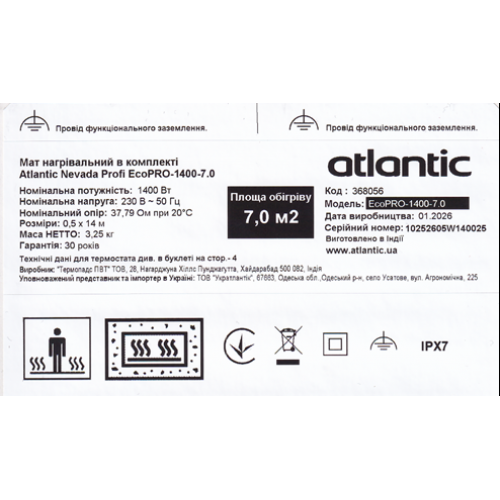 Электрический теплый пол Atlantic Nevada Profi EcoPRO-1400-7.0 относится к IPX7 классу защиты.