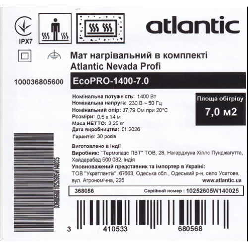 Мат нагревательный в комплекте Atlantic Nevada Profi EcoPRO-1400-7.0 – двужильный электрический нагревательный мат от французского бренда Atlantic, производитель ООО «Термопадс ПВТ», Индия.