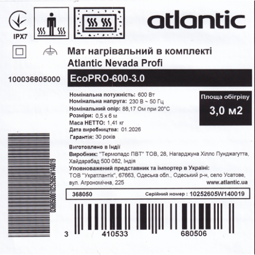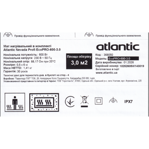 Мат нагревательный в комплекте Atlantic Nevada Profi EcoPRO-600-3.0 – двужильный электрический нагревательный мат от французского бренда Atlantic, производитель ООО «Термопадс ПВТ», Индия.