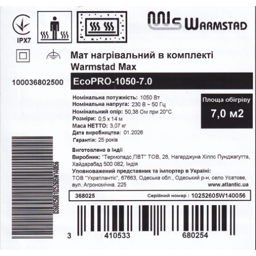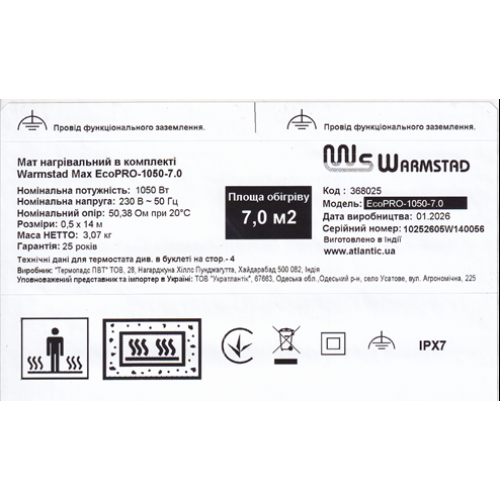 Мат нагревательный в комплекте Warmstad Max EcoPRO-1050-7.0 – двужильный электрический нагревательный мат от французского бренда Atlantic, производитель ООО «Термопад ПВТ», Индия.