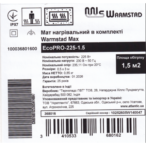 Мат нагревательный в комплекте WARMSTAD MAX ECOPRO-225-1.5 – двужильный электрический нагревательный мат от французского бренда Atlantic, производитель ООО «Термопадc ПВТ», Индия.