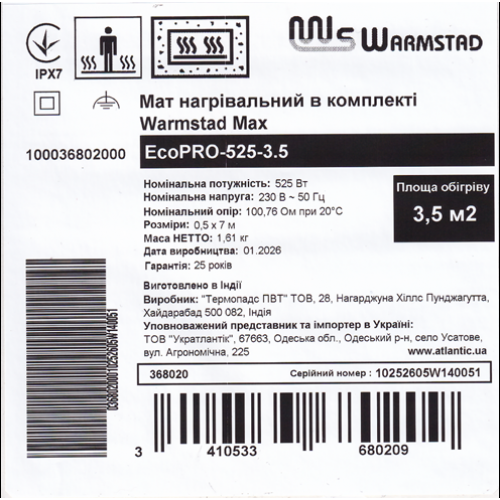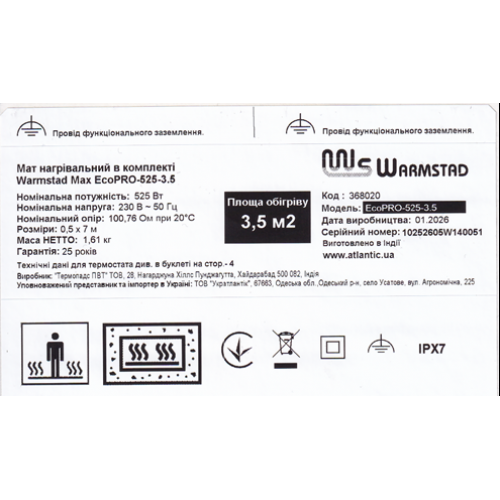 Мат нагревательный в комплекте Warmstad Max EcoPRO-525-3.5 – двужильный электрический нагревательный мат от французского бренда Atlantic, производитель ООО «Термопадс ПВТ», Индия.