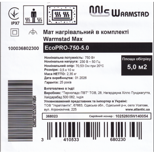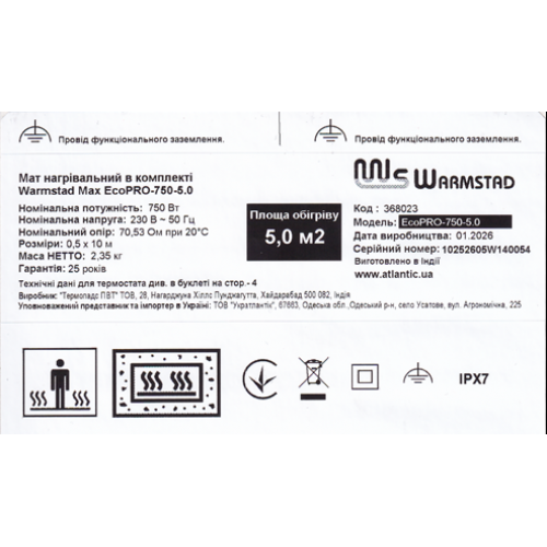 Мат нагревательный в комплекте Warmstad Max EcoPRO-750-5.0 – двужильный электрический нагревательный мат от французского бренда Atlantic, производитель ООО «Термопадс ПВТ», Индия.