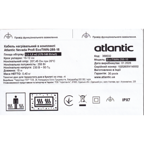 Електрична тепла підлога Atlantic Nevada Profi EcoTWIN-170-10 відноситься до IPX7 класу захисту.