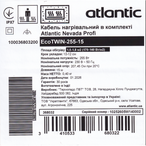 Модель: Кабель нагрівальний в комплекті Atlantic Nevada Profi EcoTWIN-255-15