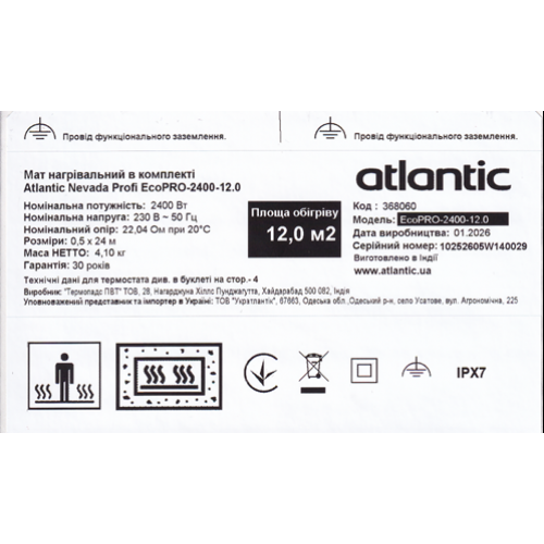 Мат нагрівальний в комплекті Atlantic Nevada Profi EcoPRO-2400-12.0 – двожильний електричний нагрівальний мат від французького бренду Atlantic, виробник ТОВ «Термопад ПВТ», Індія.