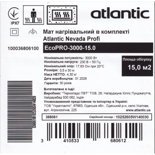 Електрична тепла підлога Atlantic Nevada Profi EcoPRO-3000-15.0 відноситься до IPX7 класу захисту.