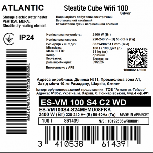 Atlantic Steatite Cube WI-FI ES-VM 100 S4 C2 WD (2400W) silver (старий артикул: 861340) – побутовий електроводонагрівач сріблястого кольору преміальної серії французького виробника Atlantic, з функцією керування через Wi-Fi.