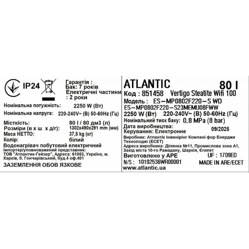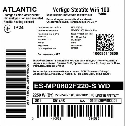 Atlantic Vertigo Steatite WI-FI 100 ES-MP0802F220-S WD (2250W) white (старий артикул 851337) – побутовий електроводонагрівач білого кольору від французького виробника Atlantic, з можливістю управління по Wi-Fi через застосунок Cozytouch.
