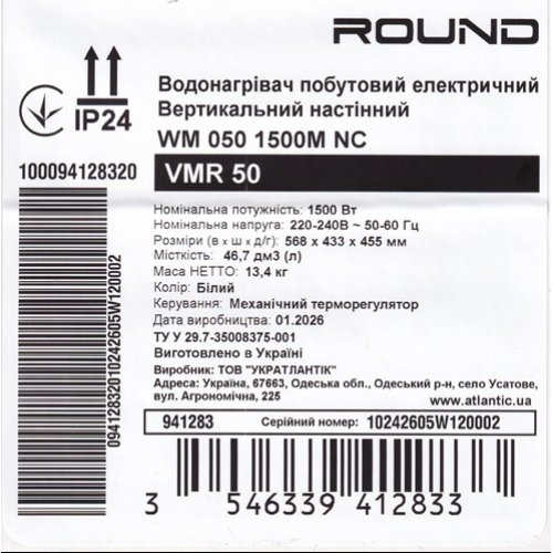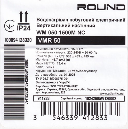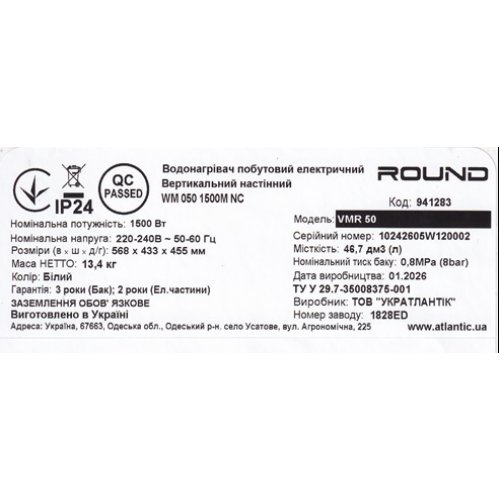 Гарантія виробника на робочий бак водонагрівача серії Round становить 3 роки, на електричну частину – 2 роки.