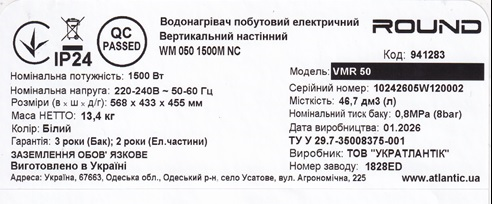 Електричний водонагрівач Round VMR 50 (1500W) – відмінне економне рішення від французького концерну Groupe Atlantic, щоб отримати гарячу воду у побуті. Водонагрівач має традиційну конструкцію з мідним ТЕНом та магнієвим анодом. Магнієвий анод використовується для захисту робочого бака та нагрівального елемента від корозії.