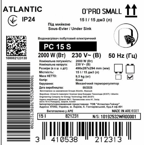 Електричний водонагрівач Atlantic O’Pro Small PC 15 S призначений для встановлення під мийкою та дозволяє забезпечити гарячою водою одну точку водопостачання. Завдяки компактним розмірам водонагрівач може бути зручно розташований у кухонних меблях.
