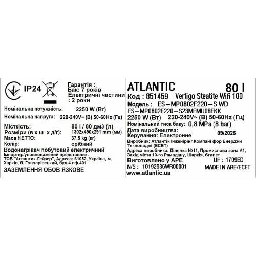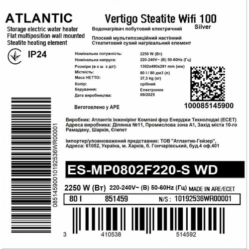 Atlantic Vertigo Steatite WI-FI 100 ES-MP0802F220-S WD (2250W) silver (старий артикул 851338) – побутовий електроводонагрівач сріблястого кольору від французького виробника Atlantic, з можливістю управління по Wi-Fi через додаток Cozytouch.