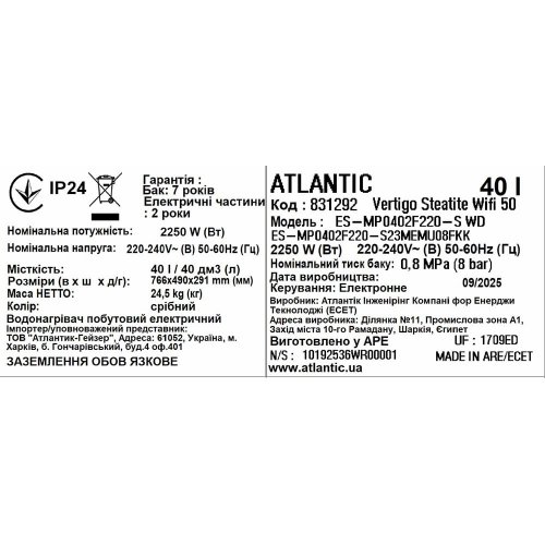Atlantic Vertigo Steatite WI-FI 50 ES-MP0402F220-S WD (2250W) silver (старий артикул 831217) – побутовий електроводонагрівач сріблястого кольору від французького виробника Atlantic, з можливістю управління по Wi-Fi через додаток Cozytouch (завантажуйте в Google Play або App Store).