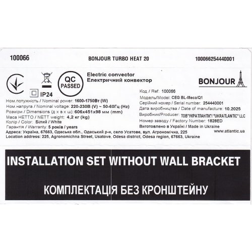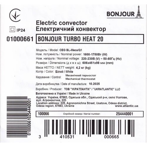 Електроконвектор Bonjour Turbo Heat 20 CEG-BL-Meca/Q1 (1750W) з комплектом підставок – автономний електрообігрівач французької торгової марки Atlantic можна використовувати як в якості основного, так і додаткового джерела тепла.